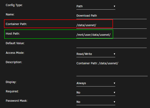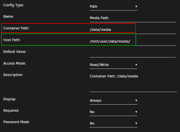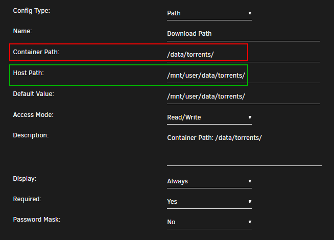 Host Path: => The actual/absolute path used on your unRAID Server (The Host).