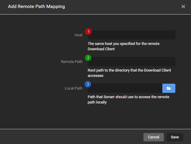 Host=> This is the hostname or IP you set in your download client settings.Remote Path=> The download path that you've set in your download client.Local Path=> The path Sonarr needs to access the same path.